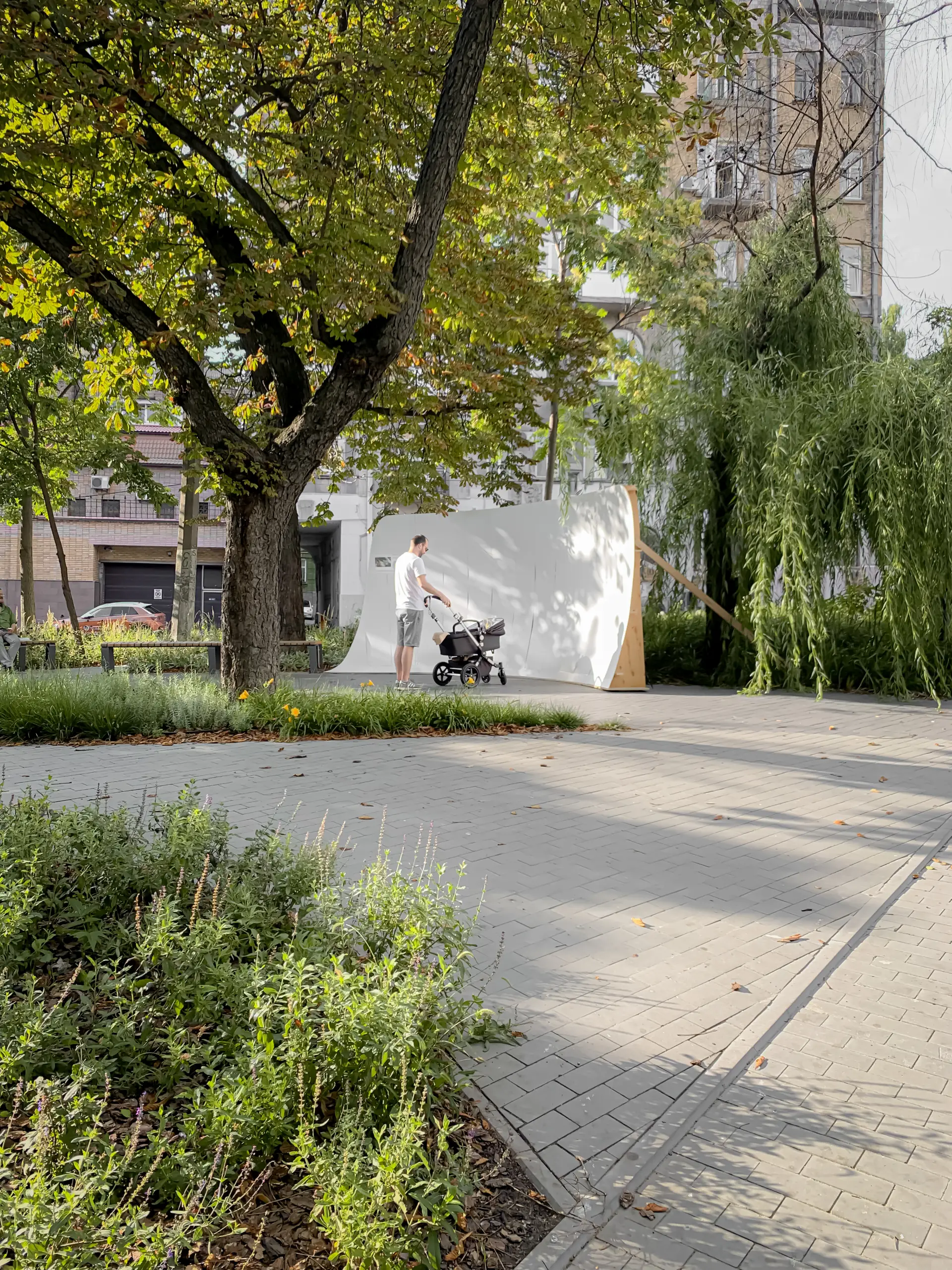 Thus, at the corner of Oles Gonchar and Bohdan Khmelnytsky streets, standing 12 meters apart at the focal points and speaking toward the nearest part of the installation, people can hear each other much better than the surrounding city noise. A temporary prototype of the installation has been set up, demonstrating the desired effect, and it will be replaced with permanent acoustic surfaces made from durable street materials.Consequently, the location that previously housed a communist monument, with a configuration resembling an ellipse, suggested a solution—to create a cozy space for people to communicate. You can also hear the sounds of passing pedestrians or the chirping of a bird flying by.As for the other improvements made to the Communication Garden that have already taken place: minimal changes to the configuration of the green space and hard surfaces (while preserving existing trees and adding more) have been implemented to achieve smoother pathways and greater comfort in the resting areas, an increase in the number of benches for seating, and the planting of perennial plants to enhance biodiversity.