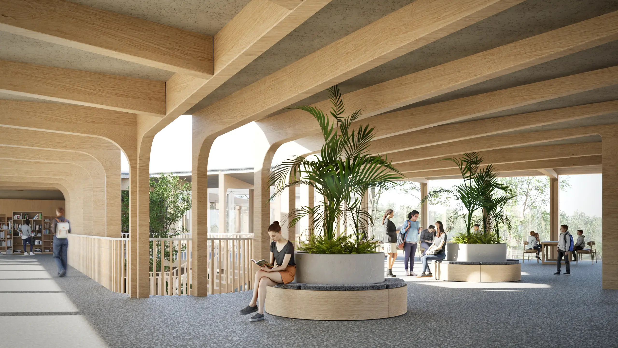 Minimalist block volumes create a clear structure through a repeatable structural module. The main entrance acts as the architectural accent — a recessed opening in the central volume, sheltered by moderate cantilevers. Local communication hubs include atrium staircases under glazed roofs in the middle/senior block and a winter garden for the younger pupils. The library on the second floor extends the informal social space of the ground level.
