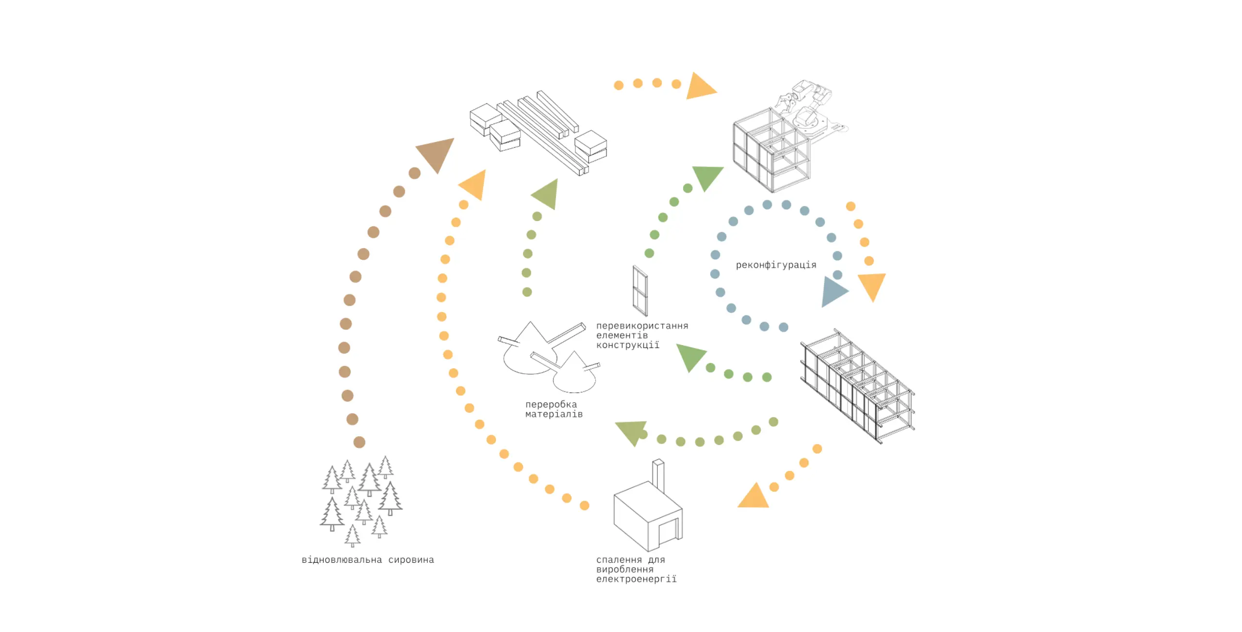 The school's sustainable strategy aims to minimise its carbon footprint (CO₂-equivalent emissions) at all stages — production of materials (renewable timber that stores carbon), transport (local materials such as Ukrainian-made CLT and glulam GL24H), construction (assembly of prefabricated components), and operation (energy-efficient heat pumps, heat-recovery ventilation, water collection and recycling). Additional comfort-focused measures include certified low-emission materials, reduced PM2.5 levels and supplementary air purification. Natural light is prioritised, as it has proven positive effects on learning.
