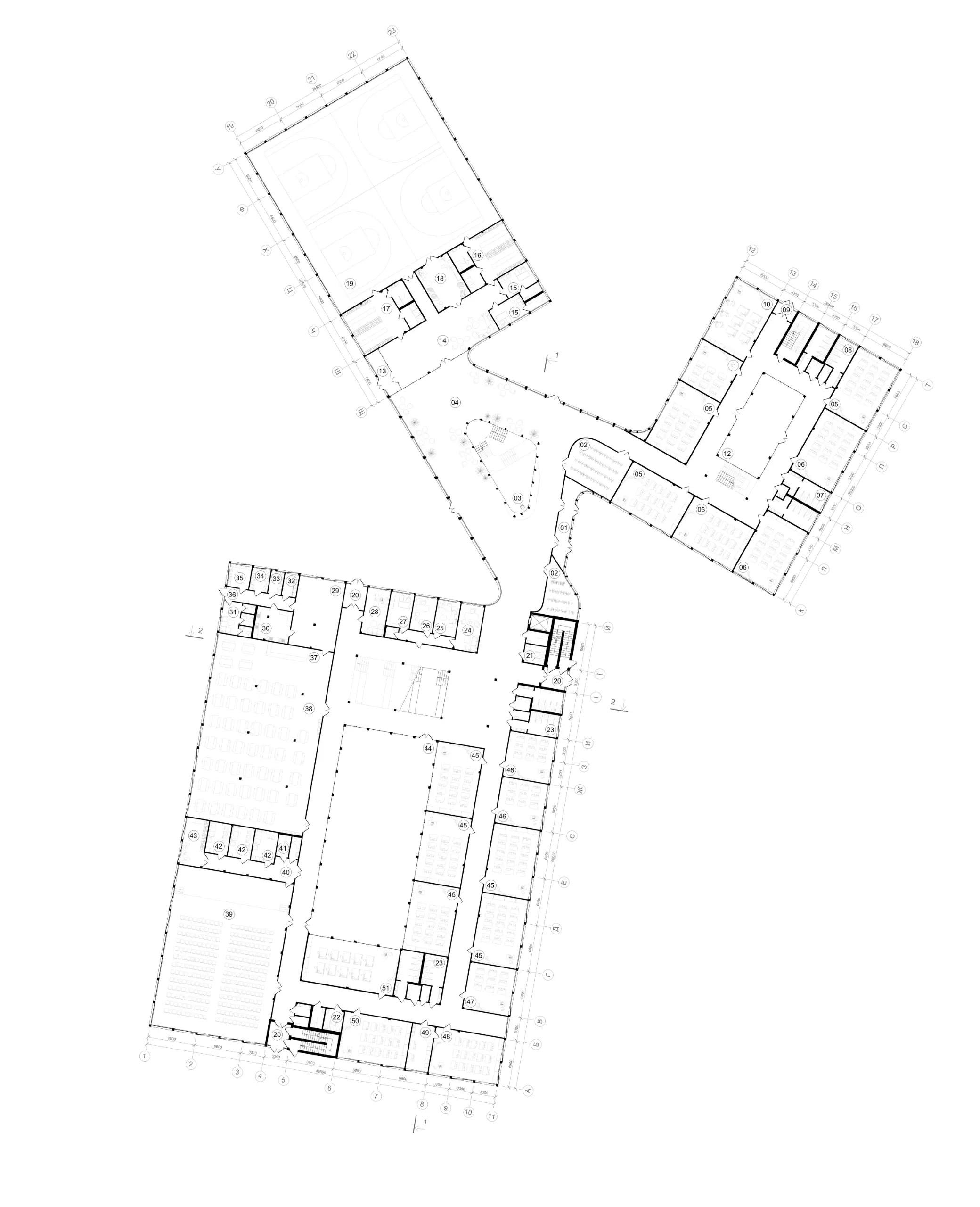 The school’s form emerges from a measured balance between specialised and unified spaces. Drawing on the strengths of both, the design introduces three “petal” blocks — for younger pupils, for middle/senior pupils, and for sports — all connected by a central communication hall with a second-floor library linked to the main entrance.