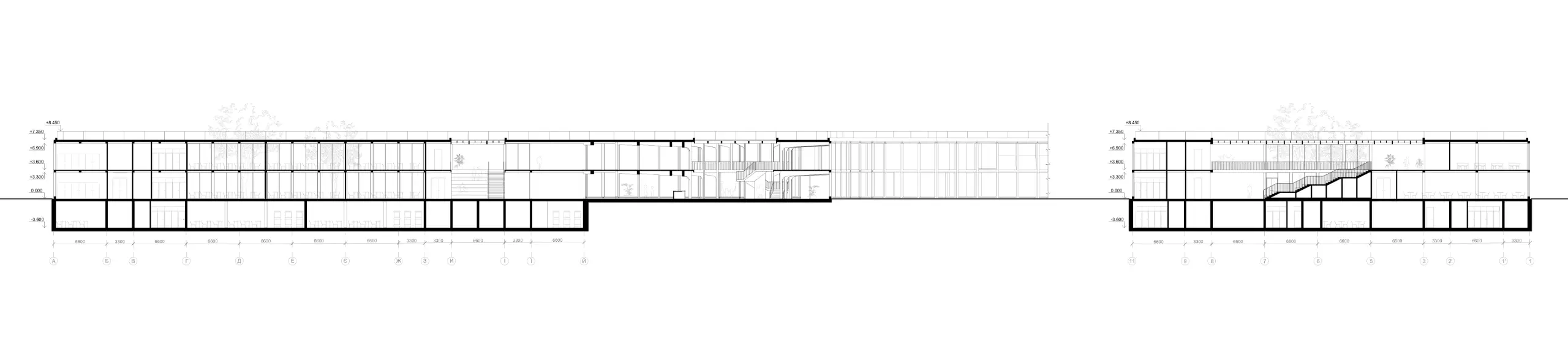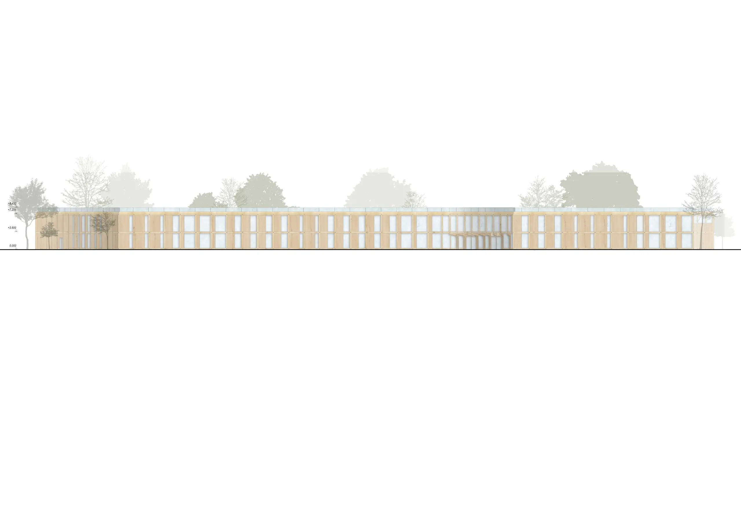 Regular façades employ variation through different transparency levels: fully glazed, fully opaque, or 25/50/75% glazing — depending on functional needs, improving natural light where required or preventing overheating. This approach ensures visual richness: horizontal façade ribbons read as elongated functional strata, avoiding monotony despite a simple structural logic.