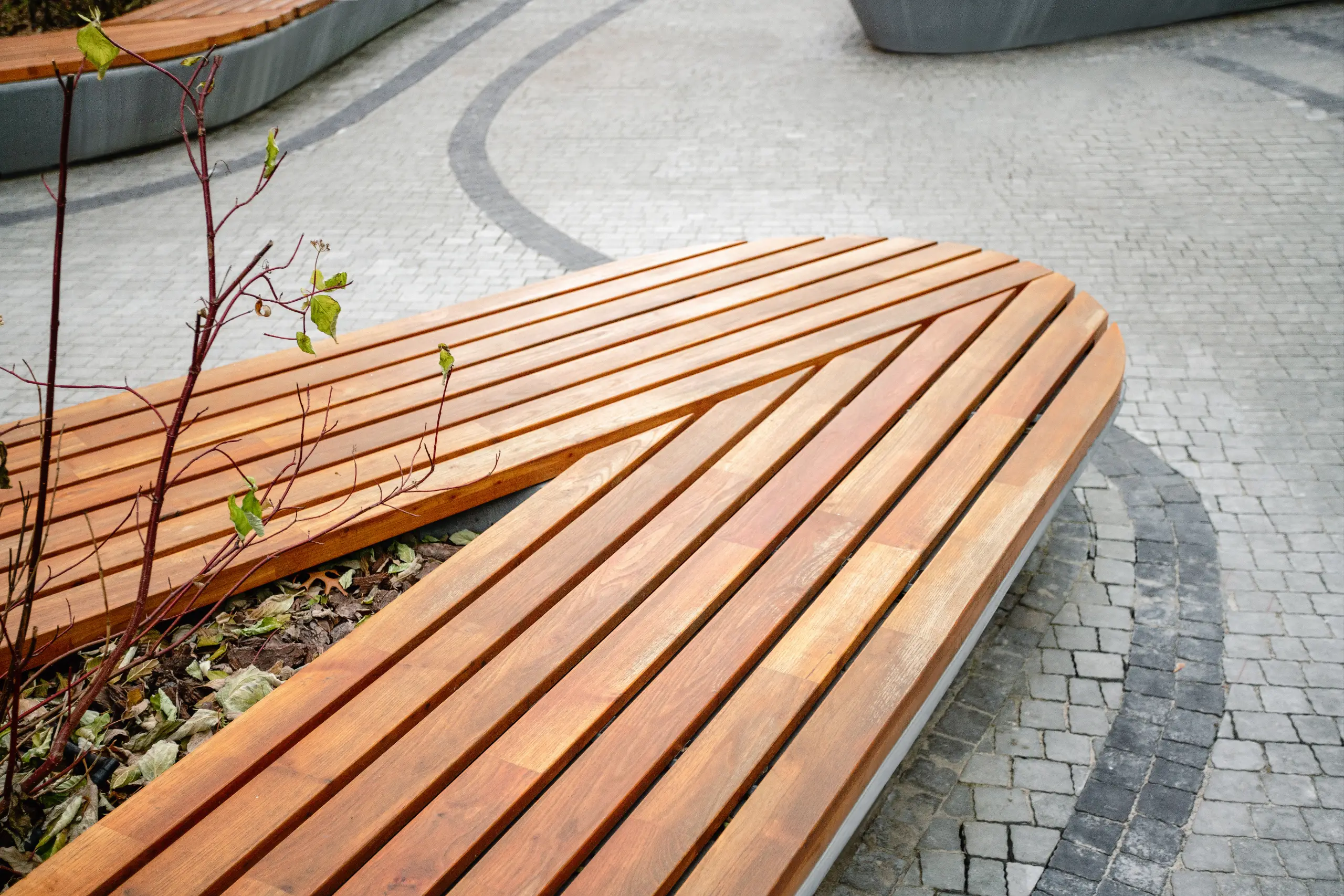 Island-shape zones are oases of landscaping. The green islands of the quiet part of the Coexistence Garden are surrounded by smooth concrete curved benches covered with the strongest Ukrainian wood - acacia. Benches have an increase in the height of seats and a decrease in the place where there are no seats. Inside bushes, there are colourful accents. These are liquidambar trees [literally liquid amber], which turn yellow in five shades in autumn.