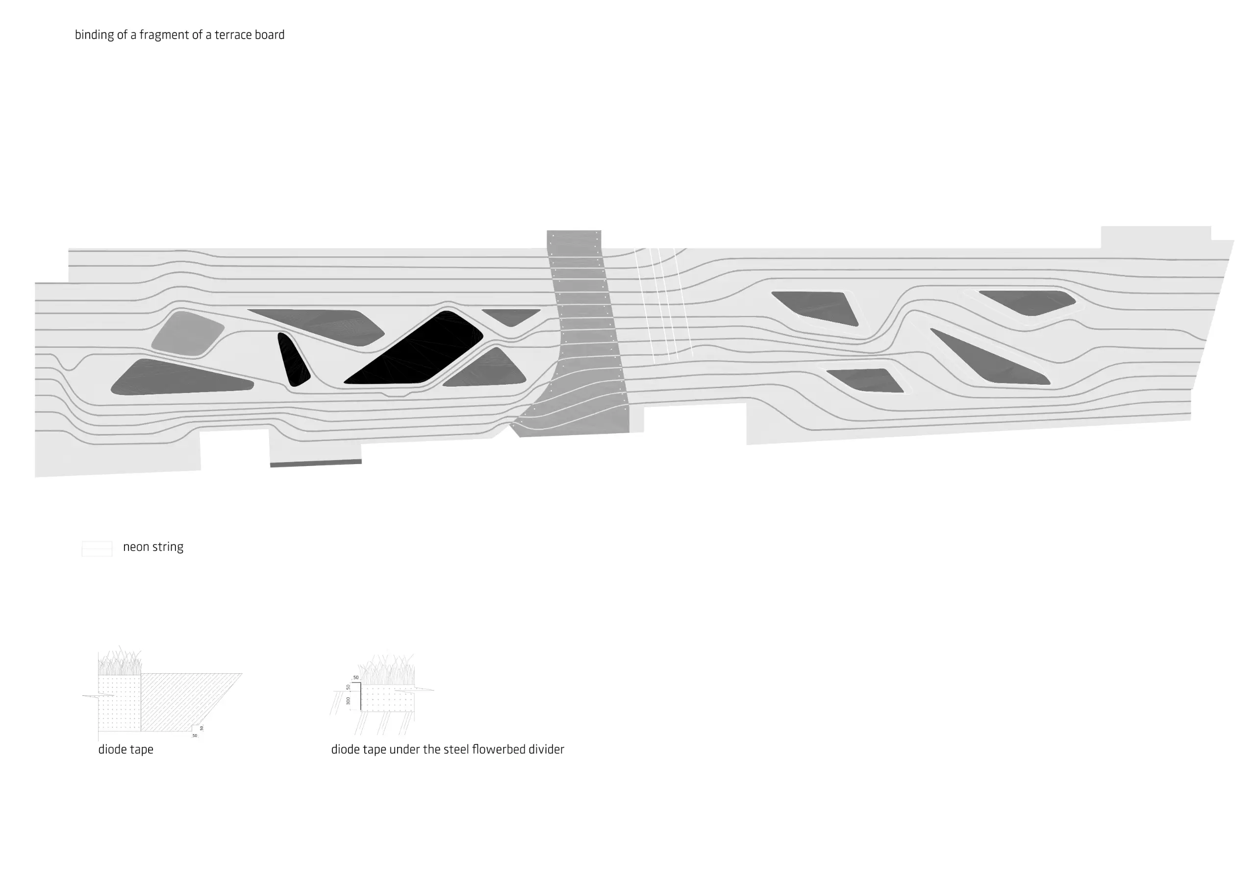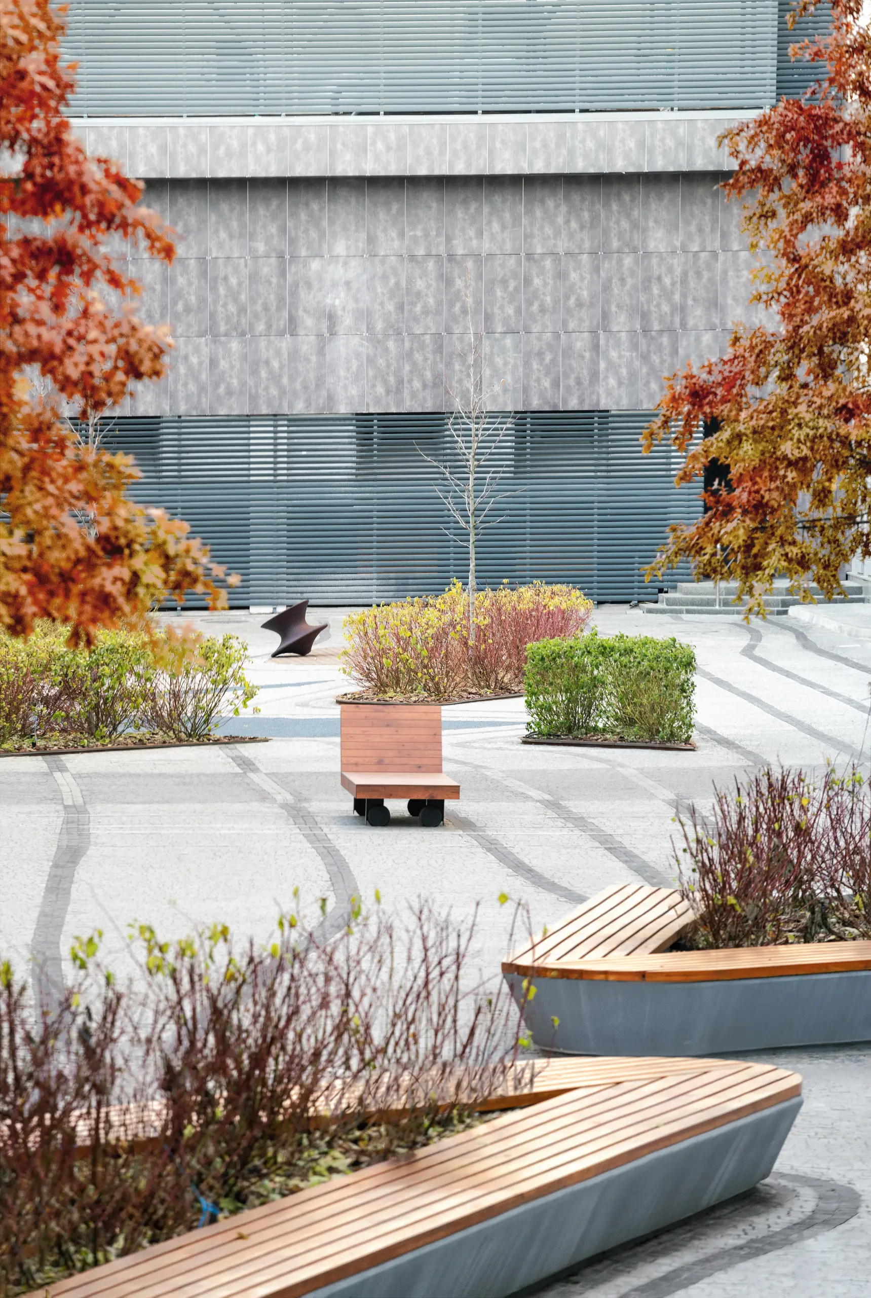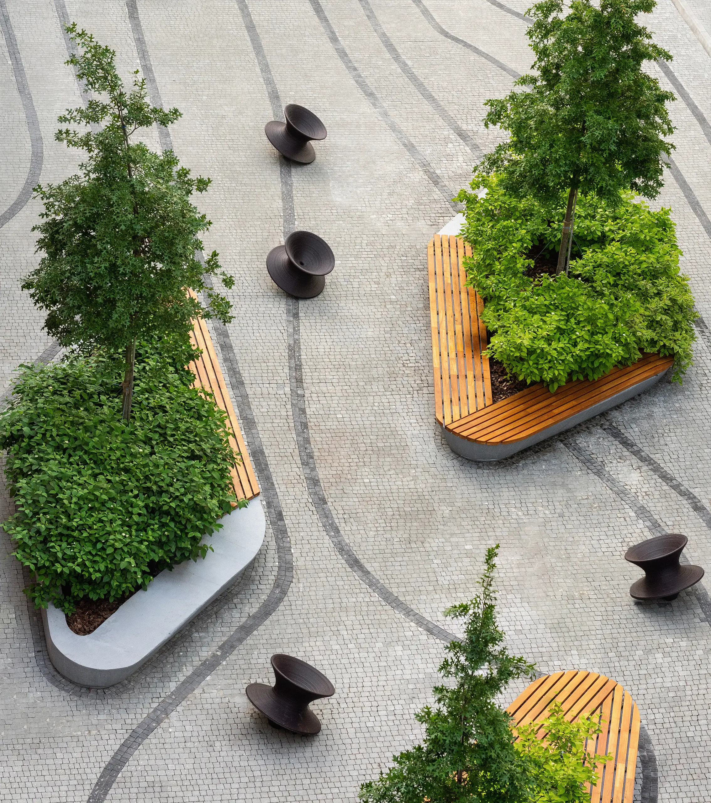 The quiet part of the Garden is separated from the active part by benches on rails, contributing to the diversification of scenarios. They can be brought together for joint rest or pushed away for intimacy and solitude.