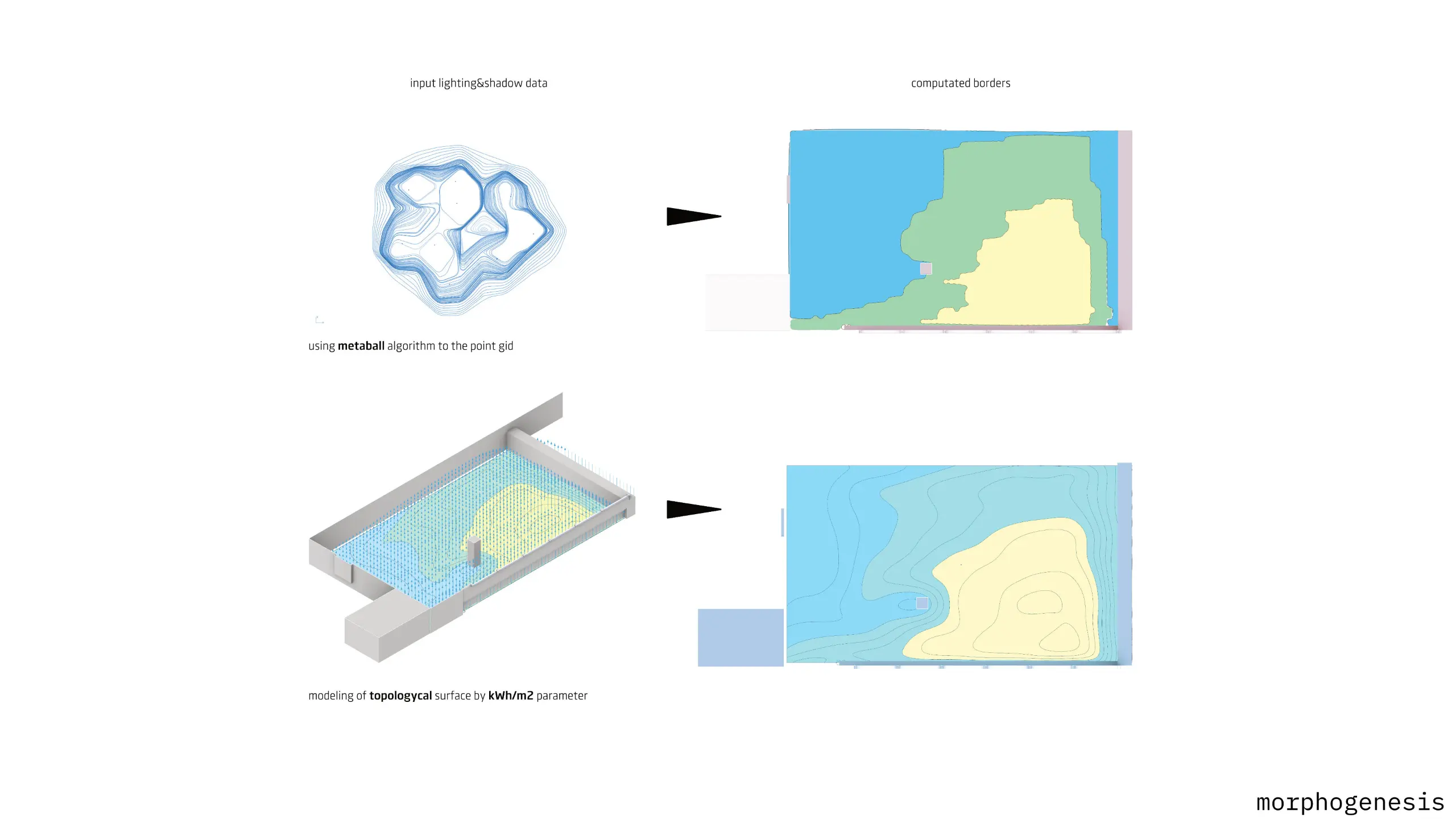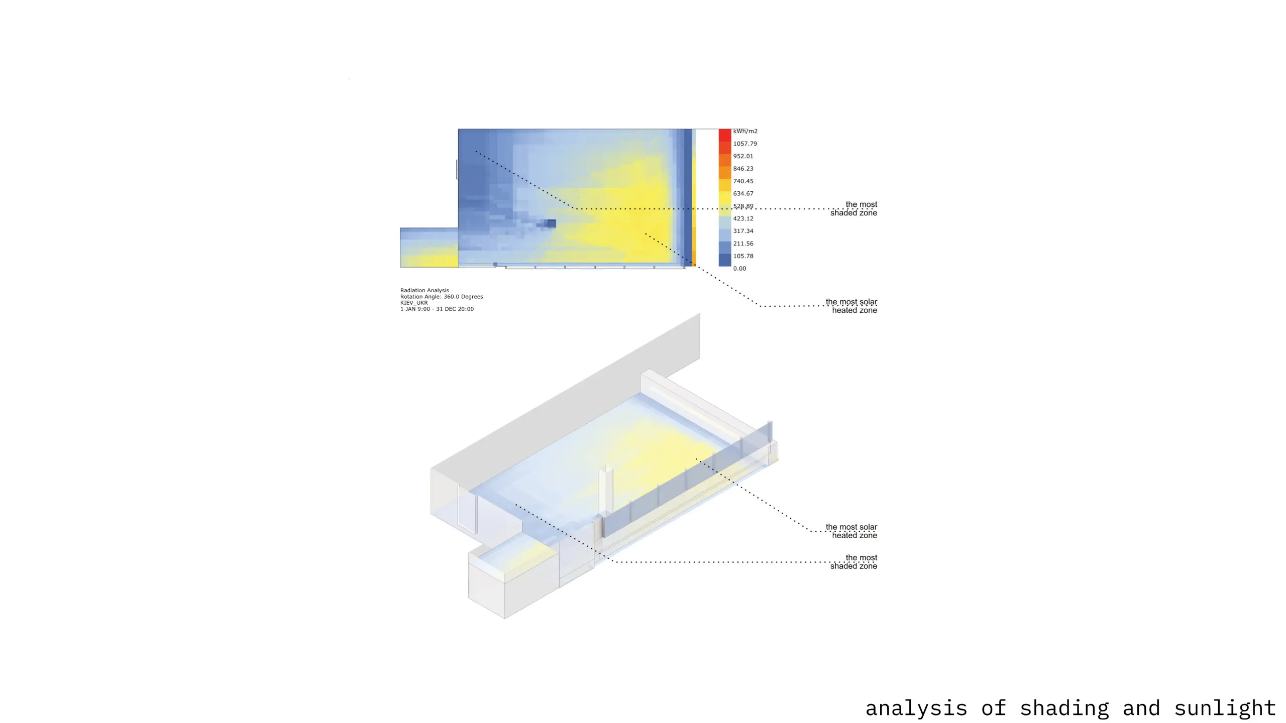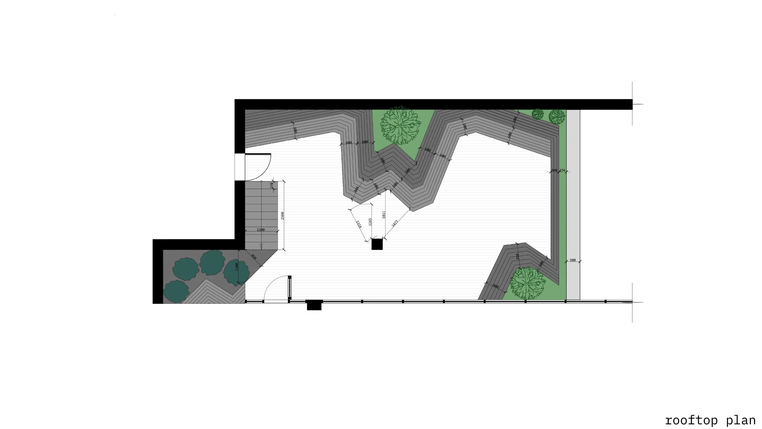 The architectural composition geometry of the rooftop is generated by a simulation showing the average number of solar radiation during the hottest period of the year.Therefore, the open-air amphitheatre is located in a temperate zone to prevent overheating for people. Levels for sitting gradually change height and grow from a terrace cladding forming a single surface. Additional elements such as flower beds and a dump are also integrated into coherent surface.Wooden boards and the modularity of their width are the main morphogenic components of roof skin. Not only planes but also surfaces are made of boards. They are made on CNC machines, which has made it possible to achieve the most continuous stripes and a holistic image (minimalist material, richness of function).