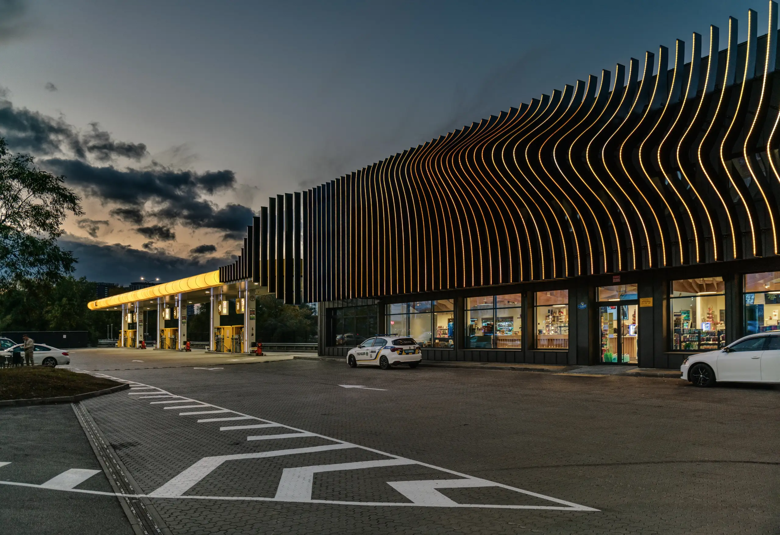 The interior space of the station’s shop and café is formed by a wooden structure that flows through magnetic lines, connecting different functional zones—magnets—and integrating lighting accents in key areas. The navigation is highlighted with infographic trajectories applied to the floor. The cosy plywood finish (a somewhat unconventional choice for petrol stations) contrasts with the monochromatic dark volume and invites people inside with the help of large glass panes that blur the boundaries between the street and the interior.