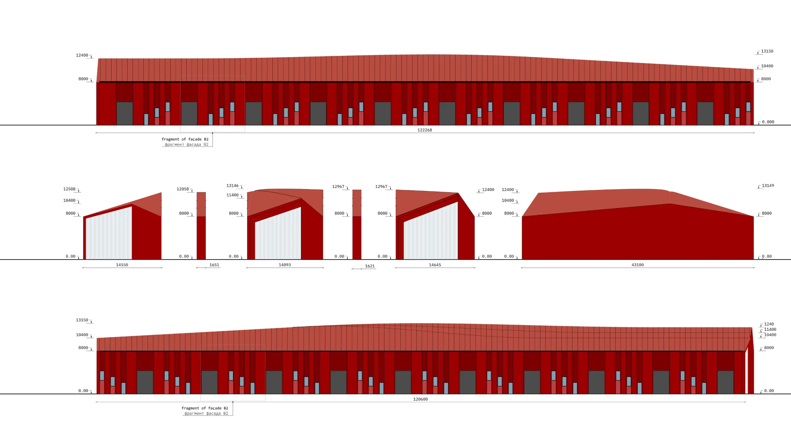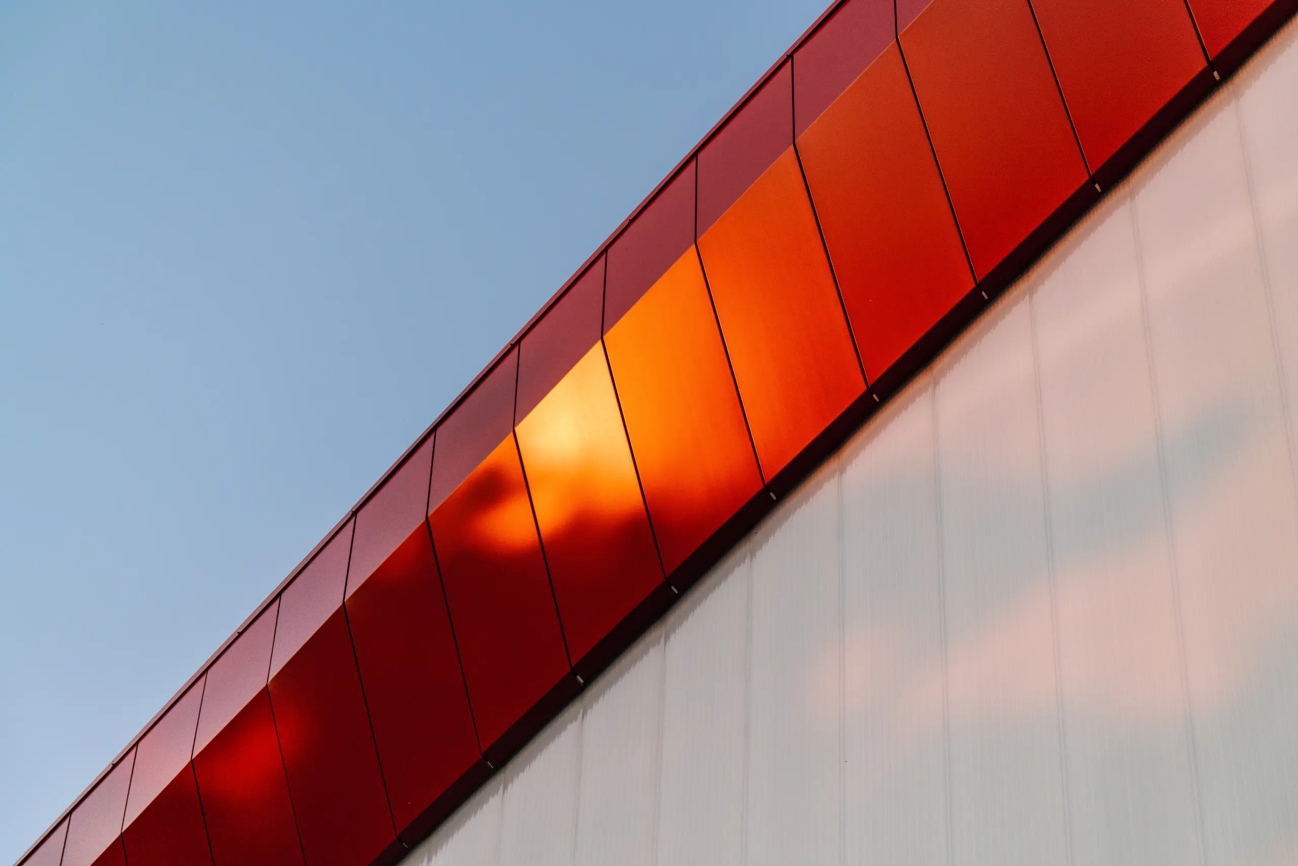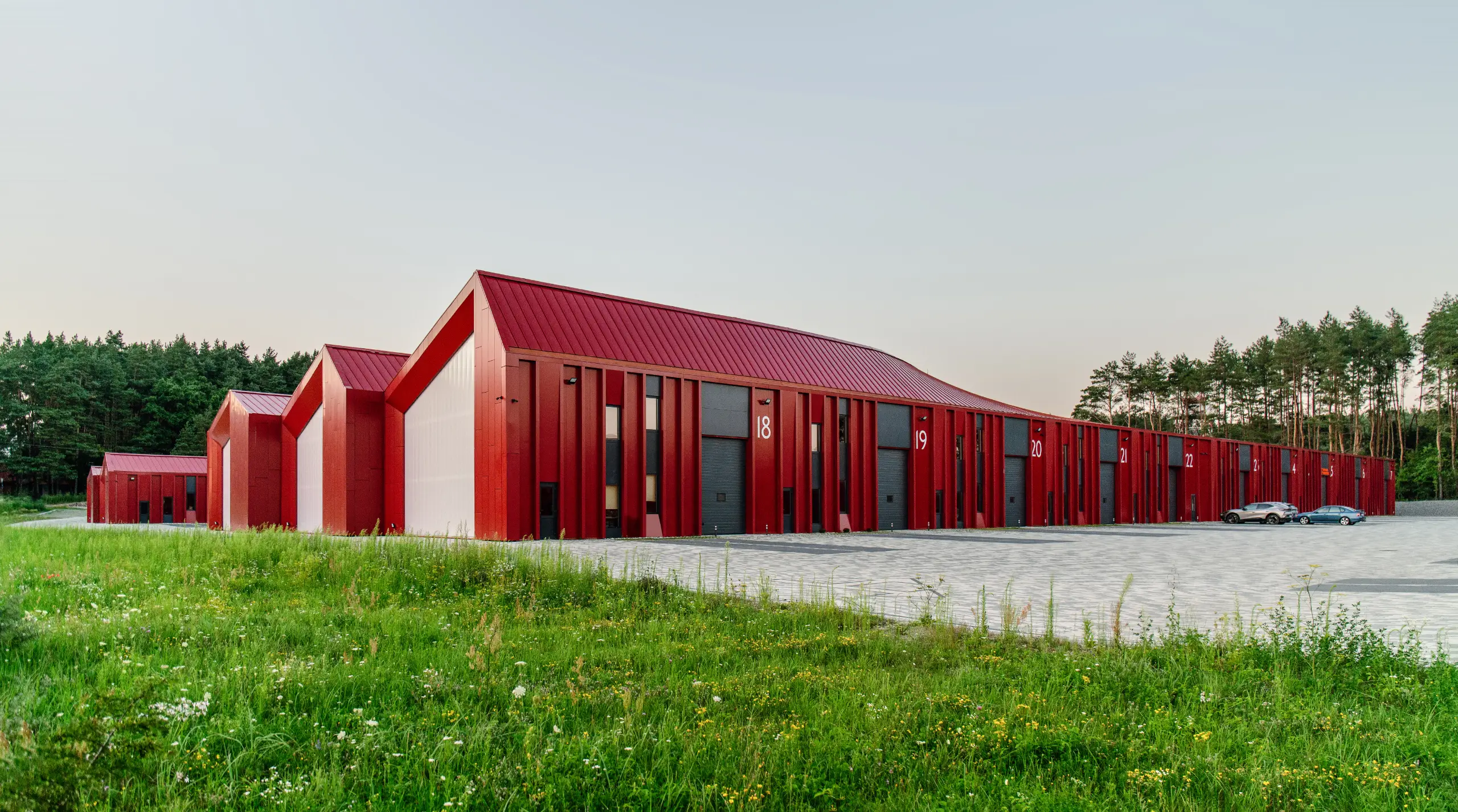 The key idea is the metamorphosis of geometry — from individual to public. The composition symbolises how distinct companies form a shared ecosystem within the hub. The architecture evolves from human-scale gabled modules into the continuous horizontality typical for logistics.Situated by the elevated Circular Road, the terraced roofs were computationally formed to ensure the full volume remains visible from the driver’s perspective. The bifurcation of pitched roofs defines the main visual rhythm and enhances recognisability. End façades with transparent glazing allow for showrooms facing the traffic, while the longitudinal façades express vertical rhythm through offset two-level office windows. The dark vertical insets balance proportion and perception under varying light conditions.Modularity ensures flexibility: tenants can select units by column grid, adapting freely to business needs while preserving architectural coherence.