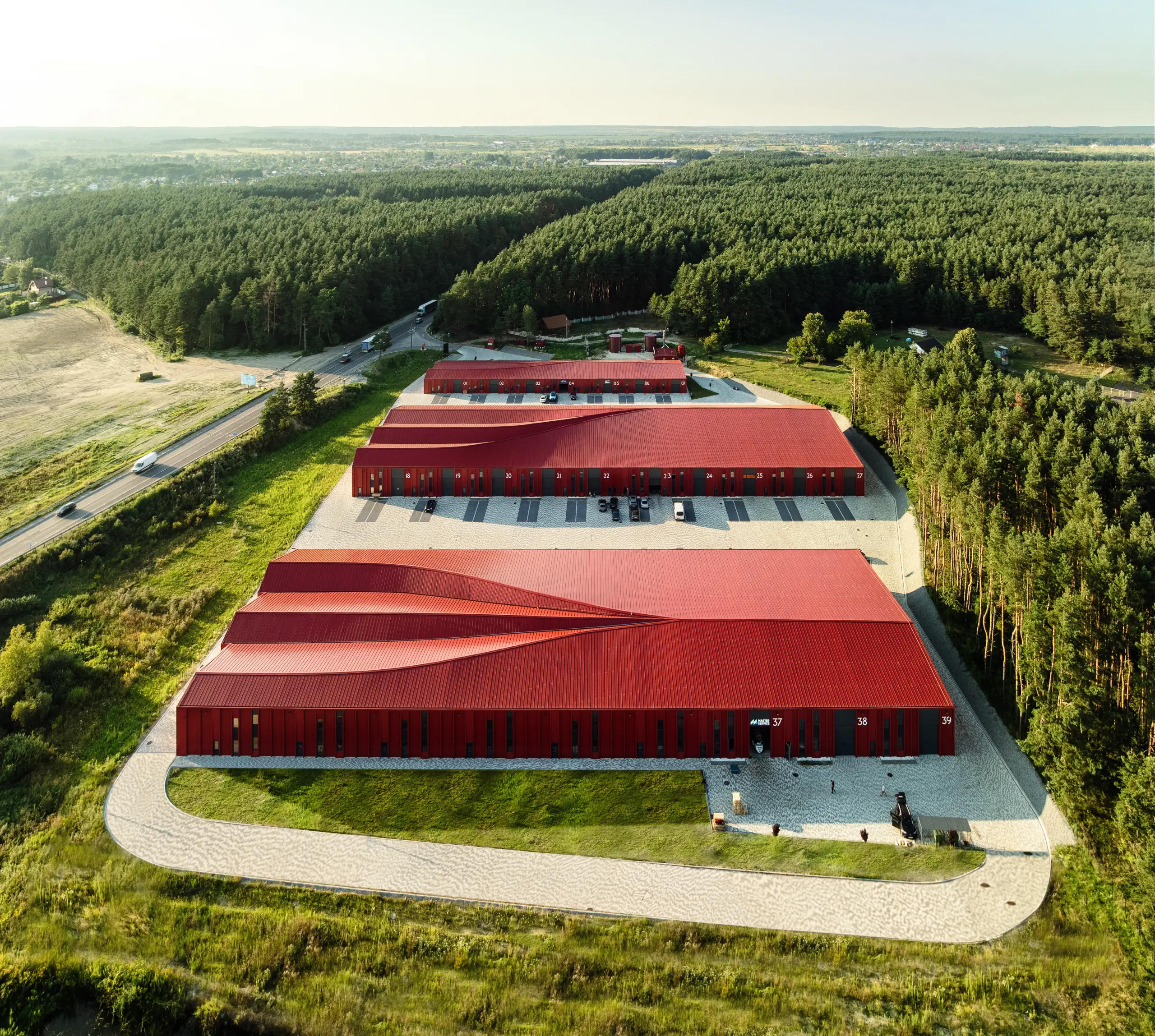 Located along Lviv’s Circular Road, in a region that has become Ukraine’s main logistics hub since the start of the full-scale aggression, PROSTIR Business Hub comprises three modular buildings totalling over 12,000 m². The complex integrates office, commercial, and storage functions within a rhythmic landscape of pitched roofs. Its red “Falun” façade contrasts the industrial context while echoing the geometry of private gabled houses, gradually morphing into a logistic scale and creating a recognisable architectural identity for the area.