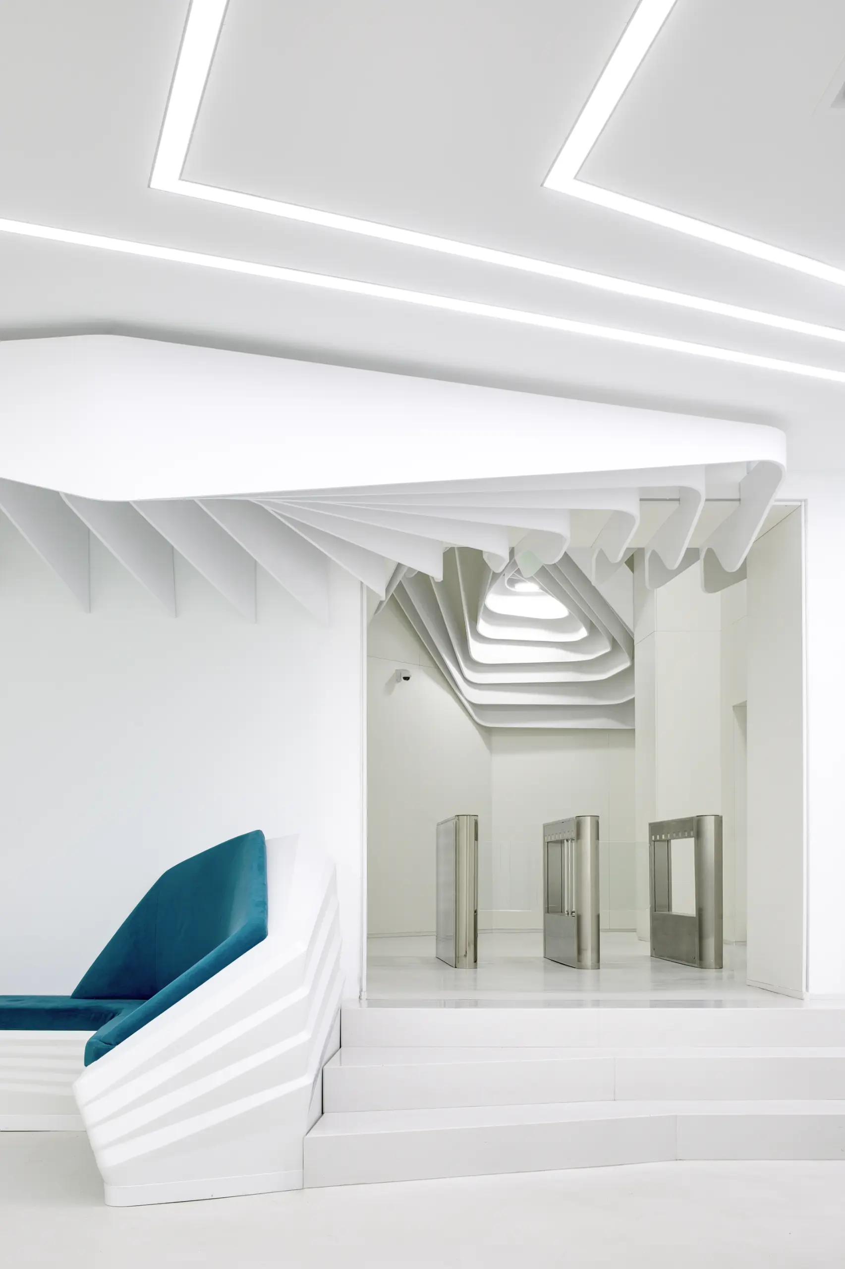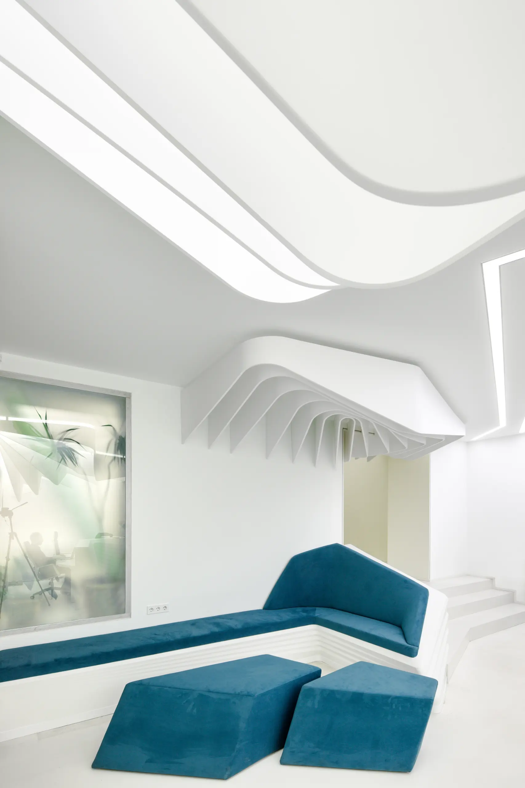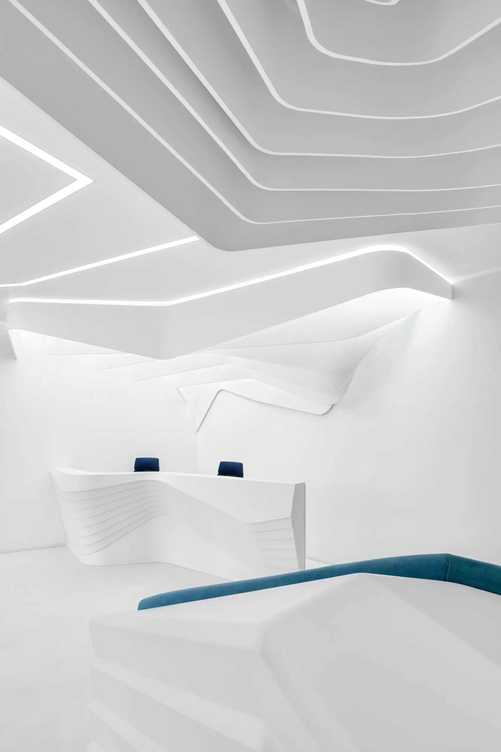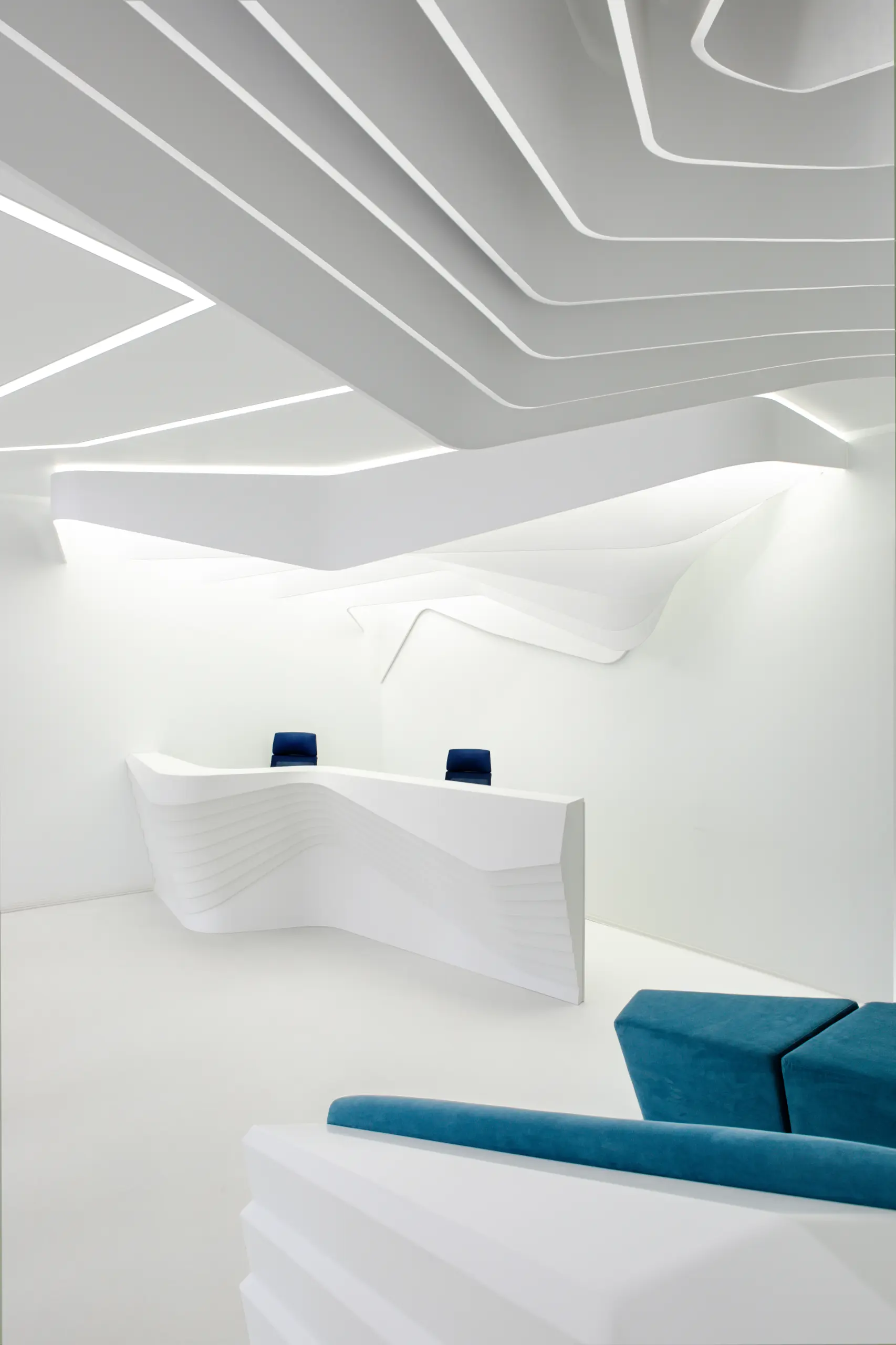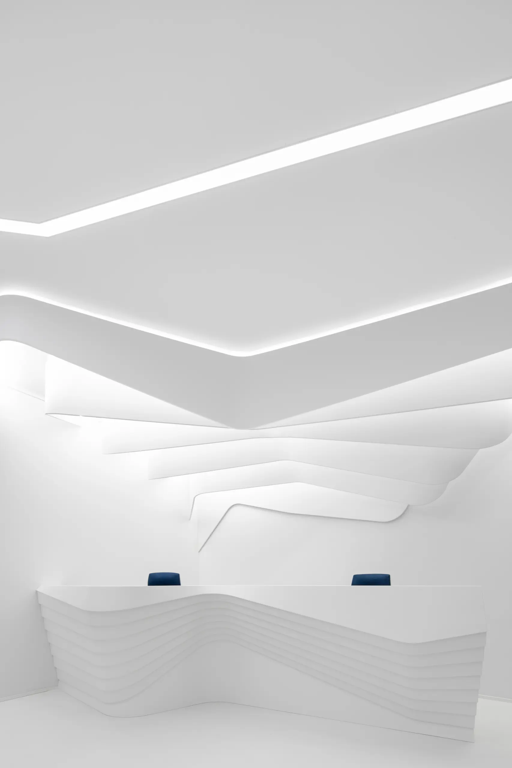 The strips on the ceiling have 2 origins, over the reception desk and the waiting/transition zone. The former has island configuration and highlights the main part of the space while the latter marks the connection between the elevators and the waiting area.Individual elements (i.e. reception desk, sofa) manufacturing comprised moulds CAM.