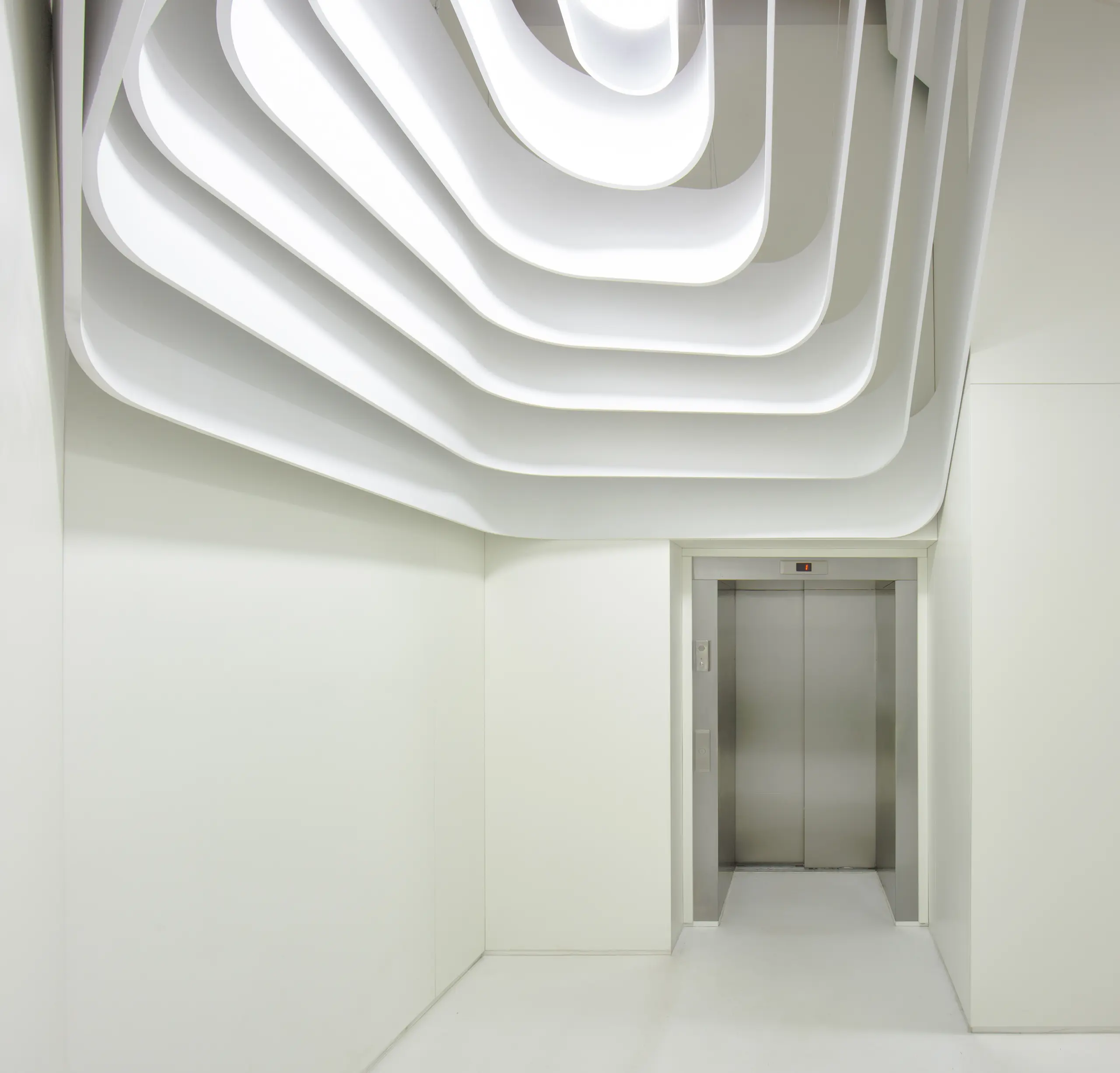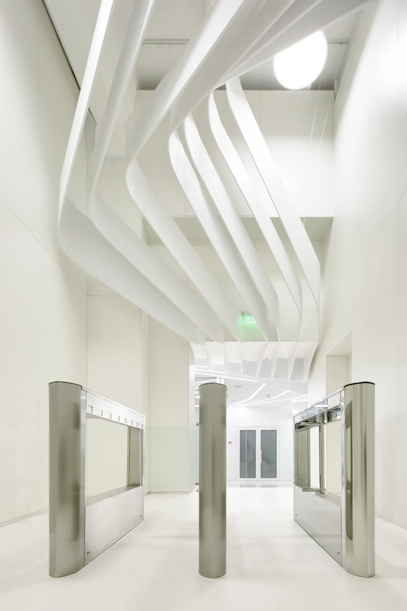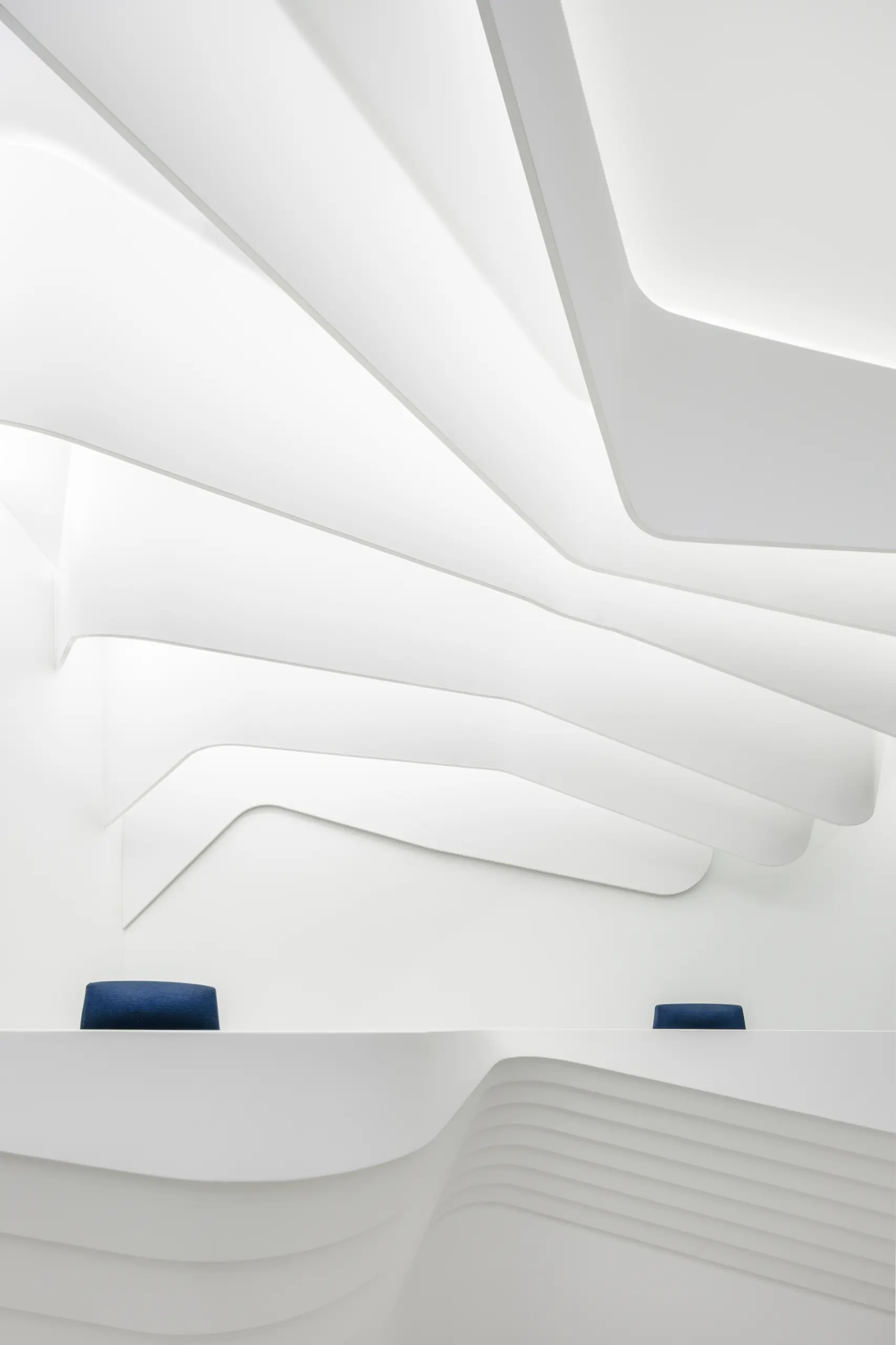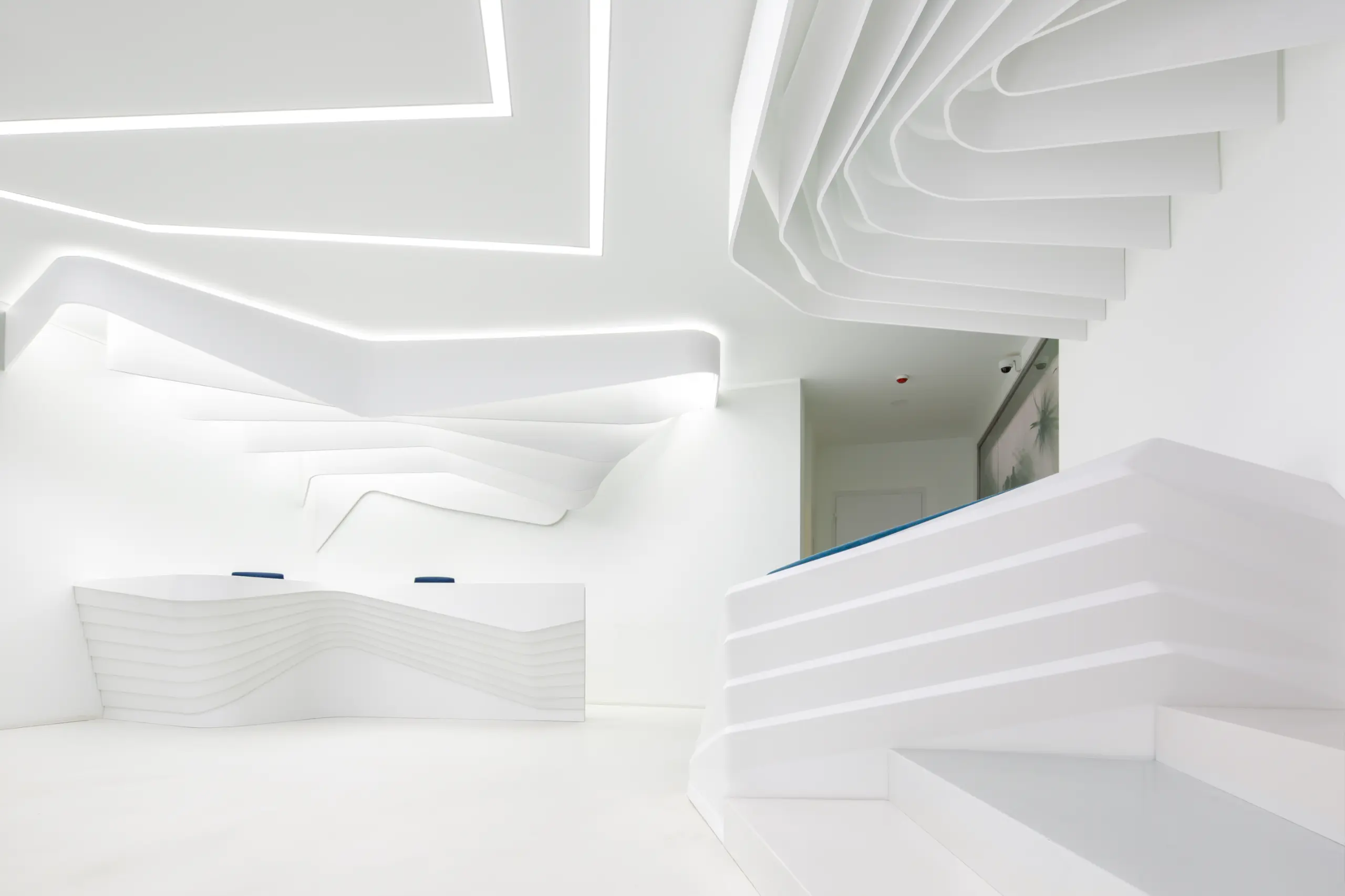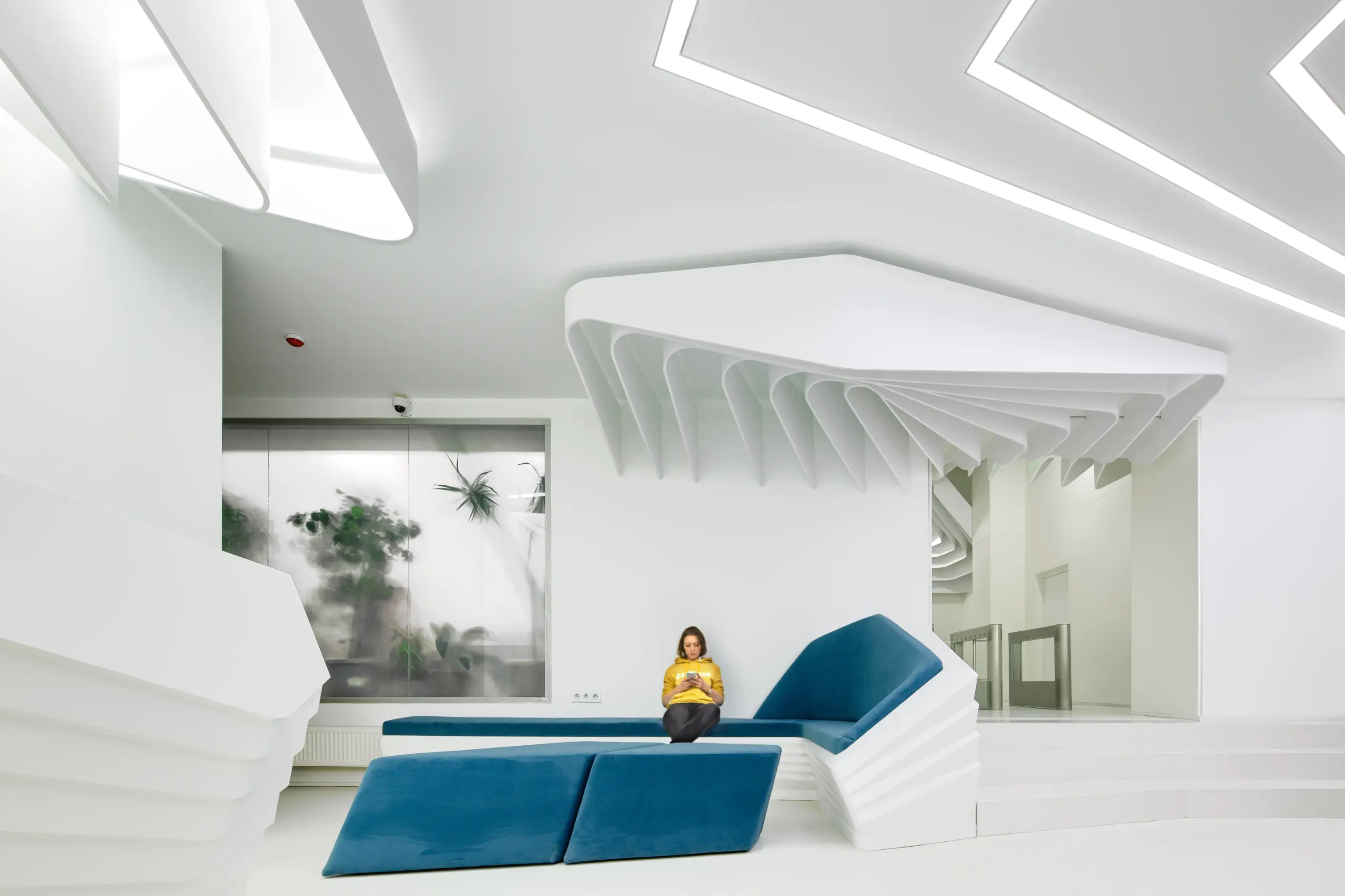 The strips on the ceiling have 2 origins, over the reception desk and the waiting/transition zone. The former has island configuration and highlights the main part of the space while the latter marks the connection between the elevators and the waiting area.Individual elements (i.e. reception desk, sofa) manufacturing comprised moulds CAM.