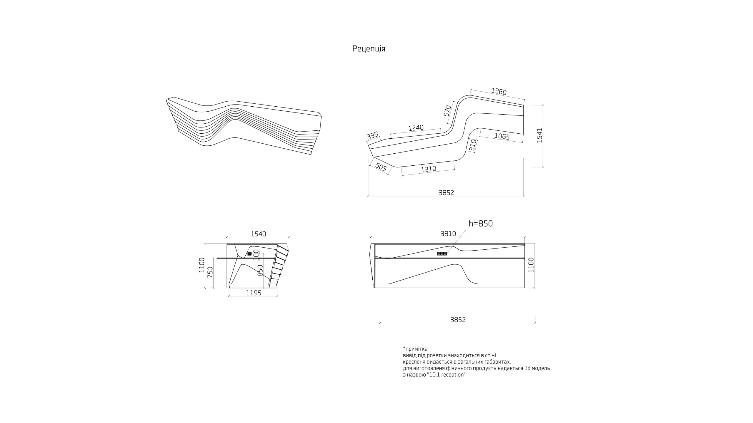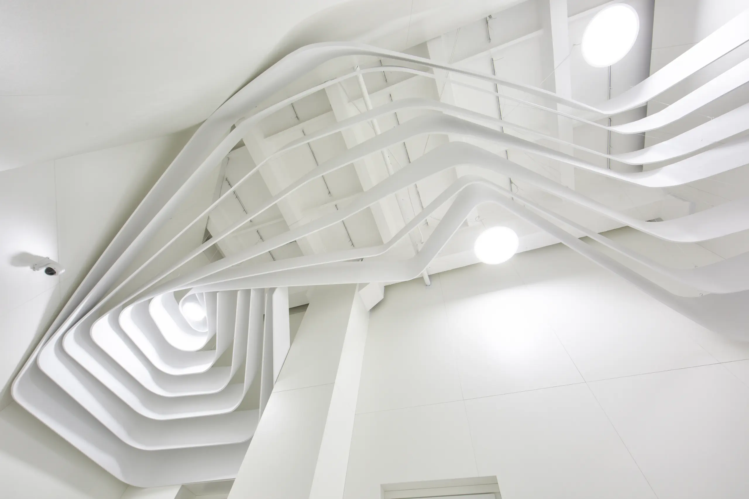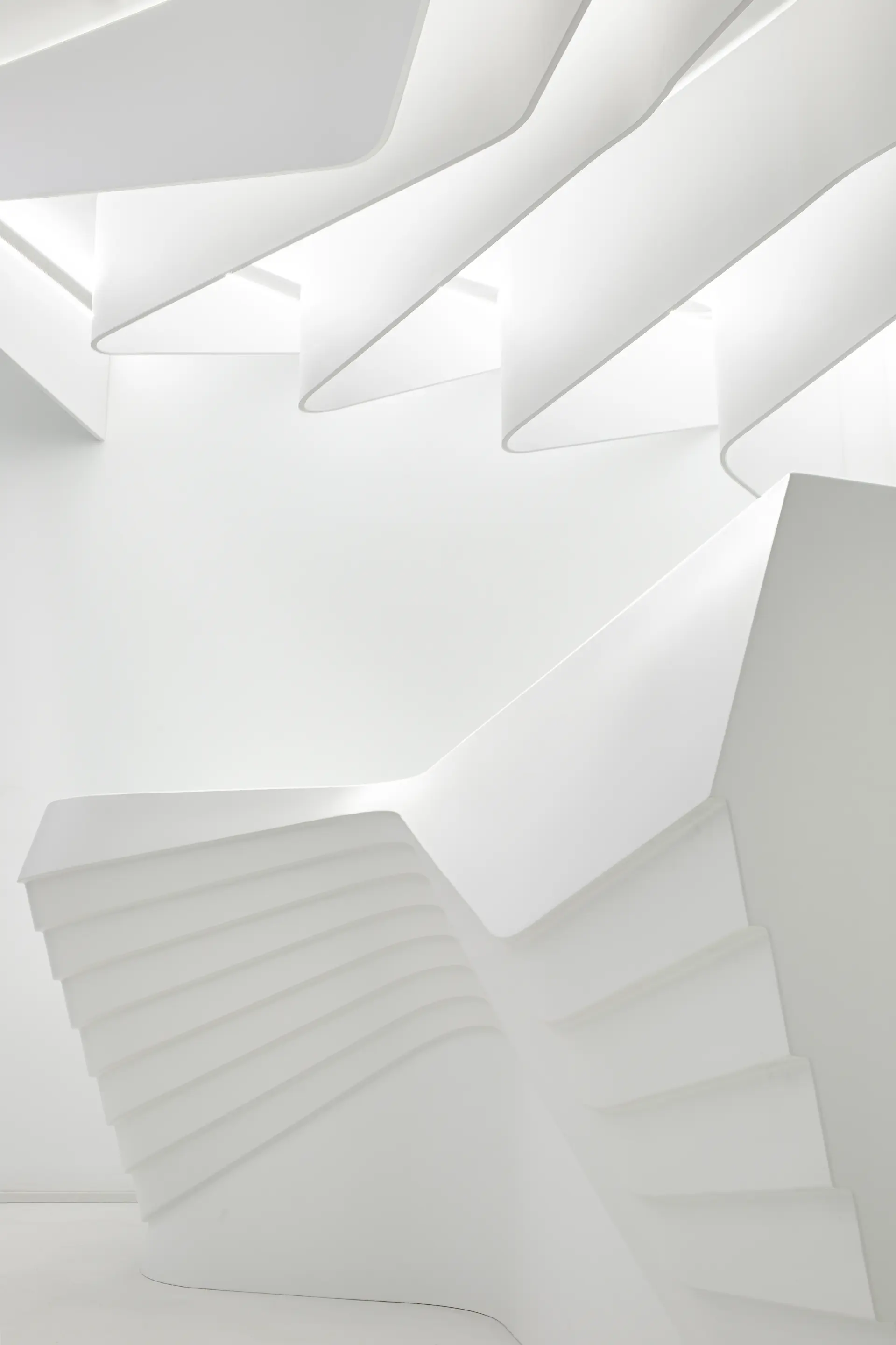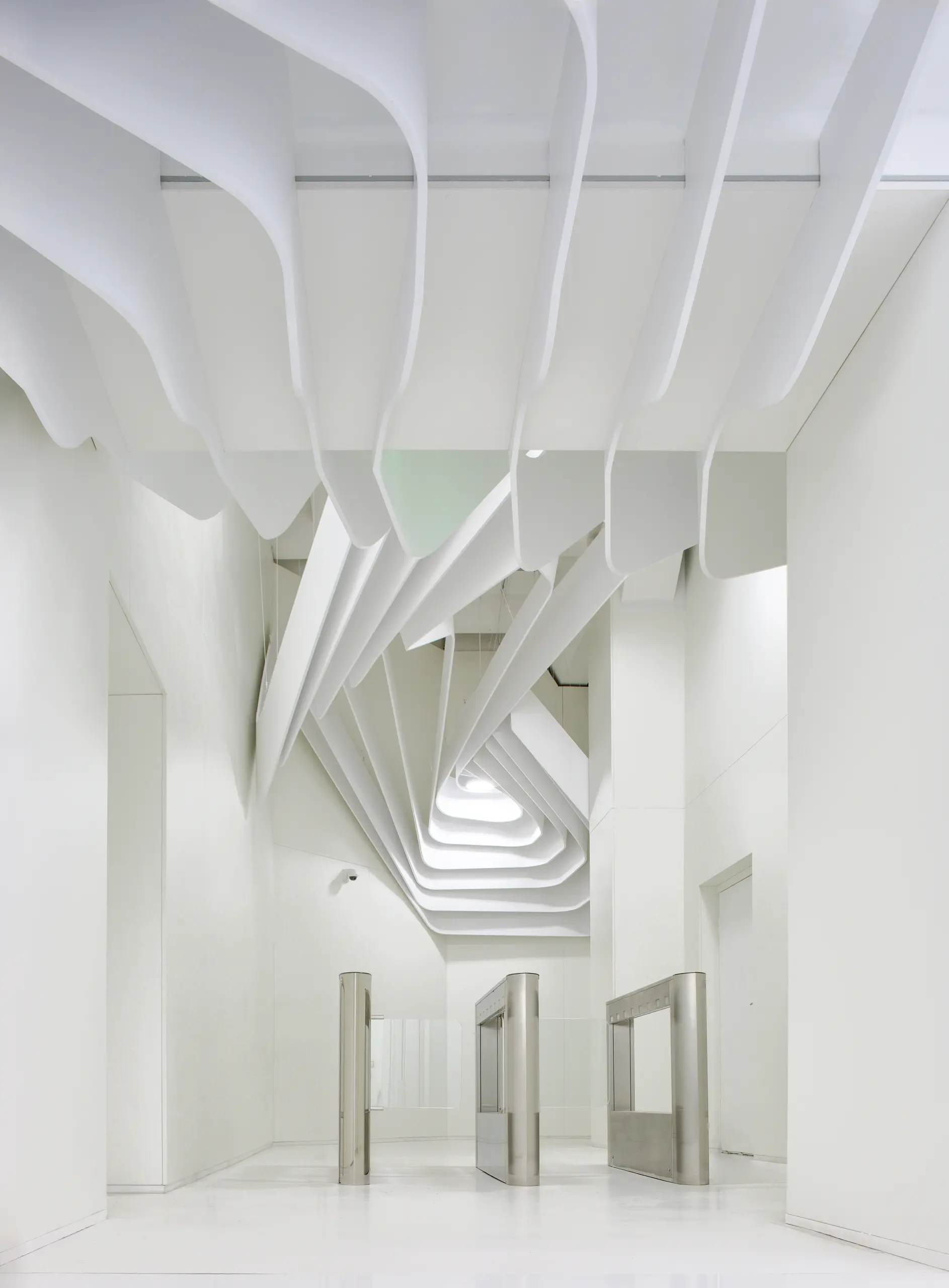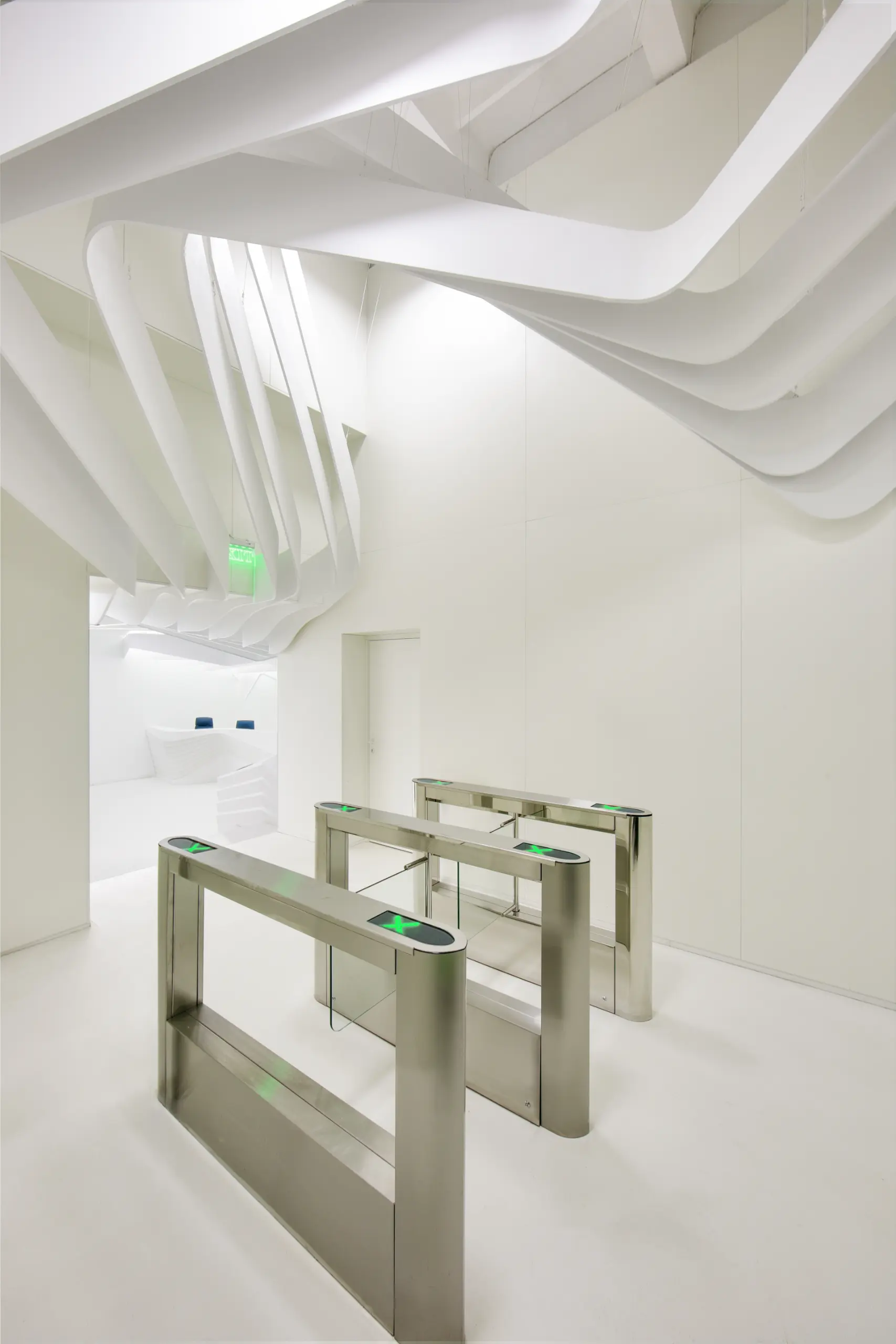 The strips on the ceiling have 2 origins, over the reception desk and the waiting/transition zone. The former has island configuration and highlights the main part of the space while the latter marks the connection between the elevators and the waiting area.Individual elements (i.e. reception desk, sofa) manufacturing comprised moulds CAM.