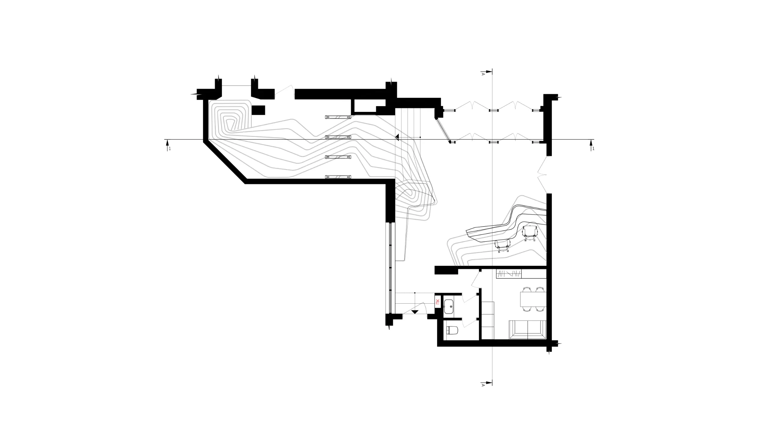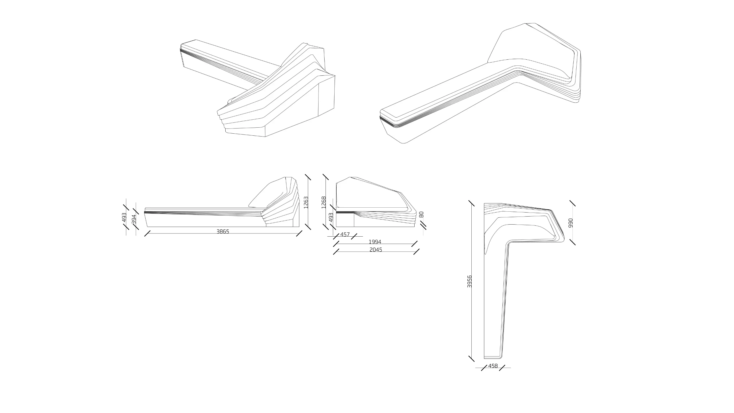 Waiting zone contains L-shape sofa, back of which geometrically merges with stairs’ side that are providing to go up from entrance level to the slightly higher level of the lift hall. The long side of the sofa for guests overlays the difference between the main space floor and the translucent partition of the upper level.The sofa’s pouf from 2 interconnected parts doesn’t have flat side faces and is a continuation of sofa’s shape, although could be reoriented and used partially.